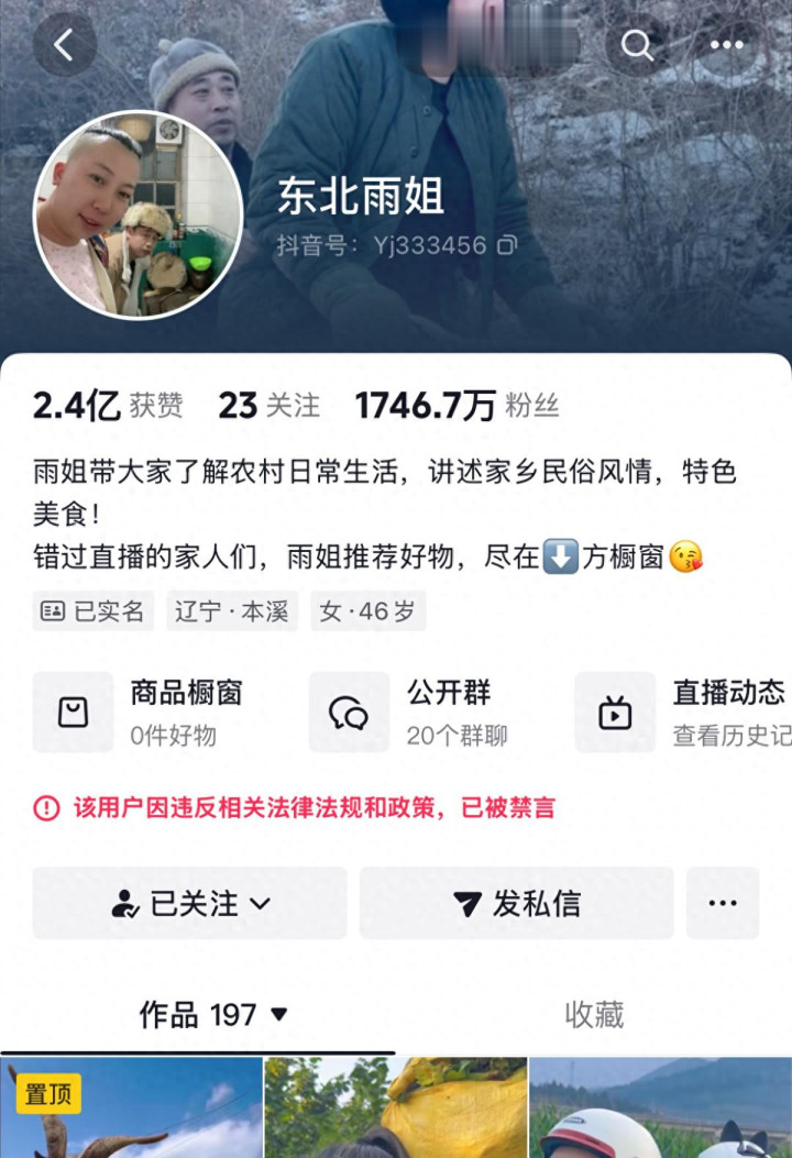 2024年10月,“东北雨姐”的短视频平台账号因违反相关法律法规和政策被禁言。